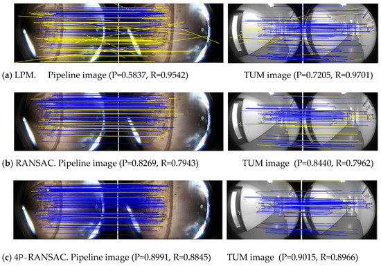 The average number of correct matches (NCMs) and the success rate (SR) of matches were calculated on the pipeline data set as shown in Table 3. To calculate the matching success rate, we first estimated the correct pose using the correspondences of the ground truth; then, we calculated the residuals of the putative correspondences under the estimated pose of the ground truth and regarded the correspondences with residuals less than 3 pixels as the correct matches. If the number of correct matches of an image pair was less than four, we considered that the match had failed. Due to the complex characteristics of pipeline images (e.g., motion blur, fisheye distortion, and the lack of texture), the RANSAC-type methods may fail when the number of correct correspondences is less than four pairs or there are too many outliers. Therefore, the matching success rate of the three RANSAC-type methods was only 96%. The introduction of IMU assistance did not improve this situation, but it did increase the number of correct matches. The LPM and VFC methods are based on local geometric constraints, so they are more adaptable to these situations, and their matching success rates were both 100%, and they retained more correct matches than RANSAC-type methods. However, it should be noted that although the matching success rate can reflect the adaptability of the matching method under harsh conditions, if the restriction is too loose, the high matching success rate may also lead to undiscovered outliers. Therefore, in order to measure the performance of the matching methods, it is also necessary to consider other evaluation metrics (e.g., precision and recall).