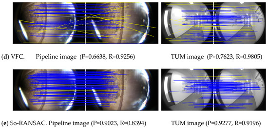 Examples of the matching results. (a–e) show the results of the matching methods. The left column shows the results on a pipeline image pair, and the right column shows the results on a TUM image pair. The blue lines indicate correct correspondences, and the yellow lines indicate outliers. For good visualization, only parts of the correspondences are displayed. (P represents the precision, and R represents the recall).