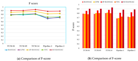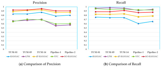 In the example of the TUM data set image in Figure 7, the performance of each matching method is relatively improved due to the better image quality and richer texture. By comparison, the precision values of the LPM and VFC algorithm were still relatively lower than those of the RANSAC-type methods, but the recall values were high. The So-RANSAC method still outperformed RANSAC and four-point RANSAC.