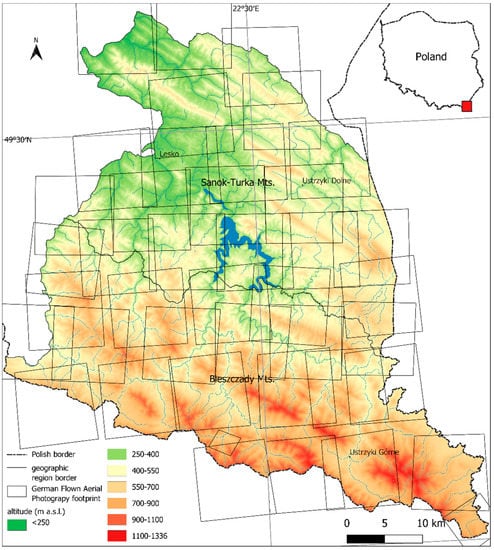 Study area—the Polish Eastern Carpathians with footprints of German Flown Aerial Photographs. Borders of geographic regions according to [37].