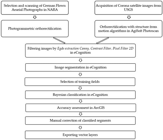 We used several software packages to achieve our goal. Working with two GIS packages (ArcGIS and QGIS) and two photogrammetric packages (ApplicationsMaster and PhotoScan) was somewhat redundant and was mainly due to the different preferences of the authors of this study. For instance, all analyses run in QGIS could have also been performed in ArcGIS, but not the other way around (e.g., the Near function is not available in QGIS). Nonetheless, a further reduction of the number of used software packages is rather unlikely; we are not aware of a package that can perform both OBIA and photogrammetric processing. Additionally, eCognition, the software we used for OBIA, achieves more accurate results than other available software packages such as OTB/Monteverdi and ArcGIS [57]. Moreover, eCognition enables to perform cleaning and filtering the image before classification, which improved substantially our results. Agisoft Metashape is a stand-alone software product that performs photogrammetric processing of digital images and generates 3D spatial data. The digital images which can be processed through the software should be produced in stereographic pair as the base photogrammetric process is Structure From Motion. This approach is suitable for Corona mission images [8,32] since the images are in a stereographic pair. The German Flown Aerial Photographs were not produced in a stereographic pair to create a specific Structure From Motion bundle adjustment; therefore, the Application Master 8.0 was used.