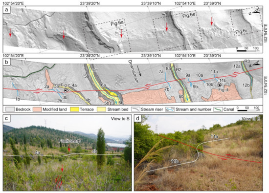 The three streams in the southern part feature typical offsets (Figure 7c and Figure 8a,b). Stream 1 is clearly offset with a left-lateral displacement of 12.1 ± 1.4 m. Two beheaded streams, 1c and 1d, were found on the left bank, downstream of the fault. The topography of the first stream, 1c, can be clearly identified, and that of the second one, 1d, is not as clear as the first one. The two beheaded streams were interpreted as abandoned streams formed after the offset of stream 1a with displacements of 18.6 ± 2.3 and 24.1 ± 3.5 m, respectively. Streams 2 and 3 are synchronously left-lateral offset by 6.9 ± 0.8 and 5.6 ± 0.7 m, respectively. A beheaded stream, 2c, was found on the left bank of stream 2 downstream of the fault and was interpreted as an abandoned stream formed after the offset of stream 2, with a displacement of 18.2 ± 2.1 m. Two beheaded streams, 3c and 3d, were identified on the left bank of stream 3 downstream of the fault and were classified as abandoned streams formed after the offset of stream 3. They are offset by 11.4 ± 1.3 and 17.3 ± 1.9 m, respectively.