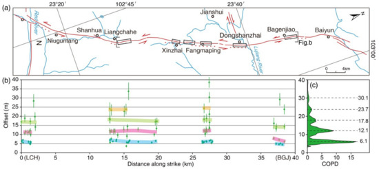 In order to further understand the offset clusters of the fault and the relationship between the offset clusters, the cumulative offset probability density (COPD) was calculated for all offsets, and a COPD distribution map was obtained (Figure 10b). The map shows that there are five probability density peaks, and these peaks decrease correspondingly with an increase in displacement, as indicated by the offset clusters. The offsets corresponding to the first, second, third, fourth, and fifth probability peaks are 6.1, 12.1, 17.8, 23.7, and 30.1 m, respectively.