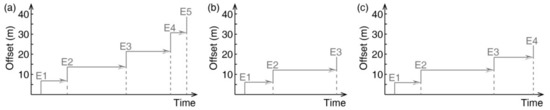 The first inflection, r1, of the riser of stream channel R1 is located close to the fault, and four inflections, r2, r3, r4, and r5, migrate about 13, 45, 67, and 75 m downstream, respectively (Figure 5d). The distance differences along the flow between inflections r1 and r2, r2 and r3, r3 and r4, and r4 and r5 are about 13, 32, 22, and 8 m, respectively (Figure 12a), indicating that the time intervals for inflection formation or seismic events are different. The distance differences between the three inflections of stream channel R2 are about 13 and 39 m, respectively (Figure 12b). Similarly, the distance differences between the four inflections of stream channel R3 are about 4, 12, and 6 m, respectively (Figure 12c). It can be observed that the time variation patterns indicated by the three offset stream channel risers have a good level of correspondence, that is to say, the time intervals of the seismic events are different, and the fault shows nonperiodic earthquake recurrence. Through trench excavations and radiocarbon dating, a recent study revealed that four recent surface-rupturing paleoearthquakes occurred on the JSF, and the estimated time interval of the most recent two events was much shorter than those between the penultimate, the third youngest, and the forth youngest events [62], which is roughly consistent with the nonperiodic earthquake recurrence pattern revealed by this study. Combined with the spatial distribution of the fault slip, it is believed that the fault follows a nonperiodic characteristic earthquake model.