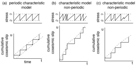 Periodic and non-periodic characteristic earthquake models. In the periodic characteristic model (a), the loading rate is constant, and the stress and stress drop during fault failure are similar for each earthquake. In the nonperiodic characteristic model (b), the loading rate may vary with time, and the stress and stress drop are similar when the fault ruptures in each earthquake. In the nonperiodic characteristic model (c), the loading rate is constant, and the stress on the fault may increase or decrease due to the influence of local stress from the adjacent earthquake, leading to an advance or delay of the rupture.