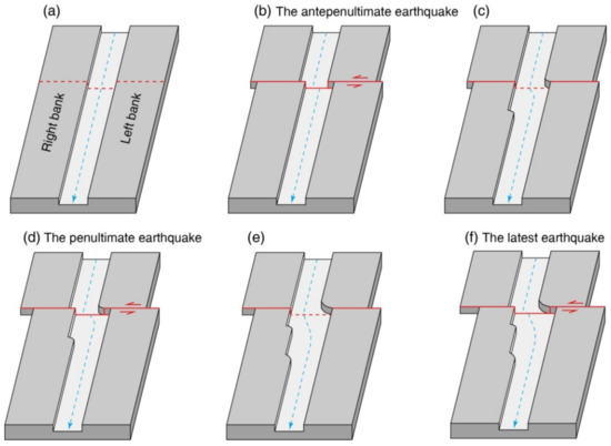 Based on the offset geomorphic characteristics of the stream channel risers in the Dongshanzhai site, we propose a geomorphic evolution model to explain the multiphase offset evolution pattern of the stream channel riser (Figure 14). The main evolution processes are as follows: (a) During the rainy season, flowing water downcuts along the slope to form a stream, and the stream subperpendicularly passes through the fault. (b) The fault produces a left-lateral strike-slip motion, and the risers on the left and right banks of the stream channel are synchronously left-laterally offset. (c) Because the riser on the right bank downstream of the fault is offset into the stream channel, the upstream facing part of the riser is eroded by flowing water and migrates downstream. The upstream part of the left bank riser of the fault is also eroded by the flowing water compared with the downstream part, and it bends upstream. (d) After a long time, the fault produces a left-lateral strike-slip displacement again, and the risers on the left and right banks of the stream channel are synchronously left-laterally offset. (e) The new riser facing upstream on the right bank is also eroded by flowing water and migrates downstream. The riser on the left bank upstream of the fault is continuously eroded by flowing water, and the curved part of the riser migrates upstream. (f) After a short period of time, the fault generates a third left-lateral strike-slip offset, and the risers on the left and right banks of the stream channel synchronously experience a left-lateral offset. It can be observed that the three left-lateral offsets on the right bank of the stream channel in the model appear as three stair-stepped inflections distributed downstream. Because the time interval between the first and second events is longer than that of the second and third events, the inflection formed the first time migrates further downstream than that formed the second time.
