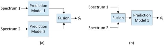 Two possible configurations for data fusion in spectroscopy: (a) fusion after prediction and (b) prediction after fusion (spectral fusion).