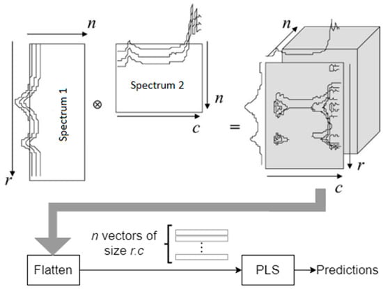 Therefore, includes the cross-correlation values between each sample of and all samples of . Considering the spectra of a soil sample as vectors, the cross-correlation may be advantageous in analysis. In outer product analysis (OPA), the OP matrix is flattened by putting the rows of the matrix along each other. Then, an appropriate modeling method, such as PLS, is used for prediction, as shown in Figure 2 [25].