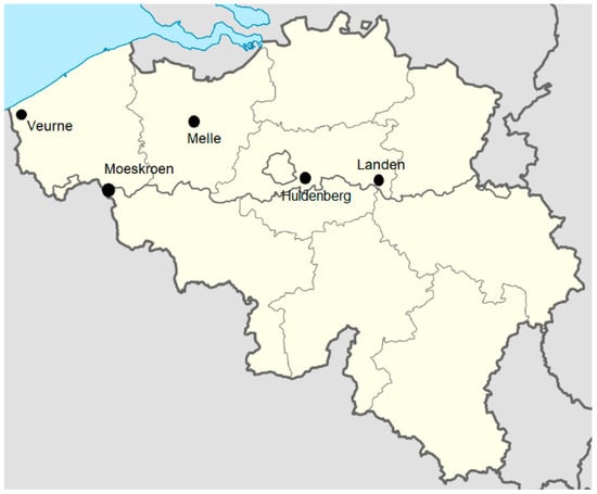 Belgium map with the geographic locations of the studied fields identified.