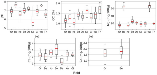 The box plot of the laboratory-measured soil organic carbon (OC), pH, magnesium (Mg), and calcium (Ca) per each field including Grootland (Gr), Beers (Be), Kouter (Ko), Bottelare (Bo), Dal (Da), Kattestraat (Ka), Gingelomse (Gi), Watermachine (Wa), and Thierry (Th). Since the ranges of Ca in Grootland and Beers were much larger than those of other fields, they are depicted separately.