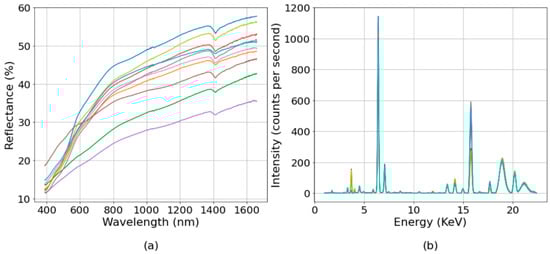 The visible-near-infrared (vis-NIR) spectra (a) and X-ray florescence (XRF) spectra (b) of 10 soil samples chosen randomly from 267 soil samples used after removal of outliers.