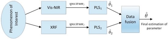 Here, the goal is to improve the estimation accuracy by fusion of the predictions given by the vis-NIR and XRF models as shown in Figure 7. To use LS for fusion, the elements of the covariance matrix, in (3), are computed according to the calibration set by [14]: