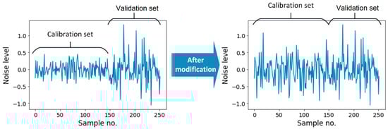 where is the prediction residual assumed to be distributed according to the normal distribution. As expected and can be observed in Figure 7, the predictions given by the calibration set have less variance than the validation set. If the variances of the calibration and validation sets are, respectively, denoted by and , a noise should be added to the prediction k of the calibration set. After the noise modification—as shown in Figure 8—the whole available predictions, i.e., both calibration and validation predictions, can be used for training and testing the data fusion schemes.
