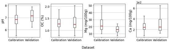 Box plots of the soil attributes and the calibration and validation datasets for pH, organic carbon (OC), magnesium (Mg), and calcium (Ca).