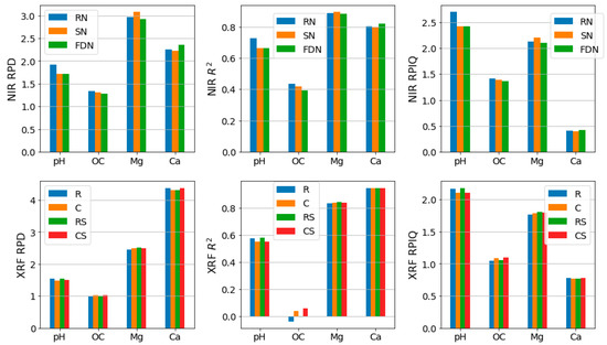 The prediction performance of partial least squares (PLS) in cross-validation modeling of visible-near-infrared (NIR) and X-ray fluorescent (XRF) spectra, under different pre-processing strategies for NIR: R: raw spectra normalized, S: smoothed normalized, FD: first derivative normalized; and for XRF: C: Compton-normalized, RS: raw spectra smoothed, CS: Compton-normalized and smoothed. RMSE: root mean square error; RPD: ratio of performance to deviation; R2: coefficient of determination; RPIQ: ratio of performance to inter-quartile.