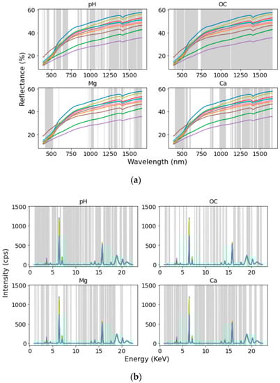 The selected spectral and energy ranges for prediction of pH, organic carbon (OC), magnesium (Mg), and calcium (Ca) using (a) visible-near-infrared (vis-NIR) and (b) X-ray fluorescence (XRF).