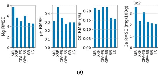 Overall, the validation results of this study suggested LS as the most robust fusion method in terms of reaching high accuracy across all key attributes. By LS, the following independent prediction accuracies were achieved: RPD = 4.08, R2 = 0.94, RPIQ = 1.64, RMSE = 4.57 mg/100 g for Mg; RPD = 3.33, R2 = 0.91, RPIQ = 1, RMSE = 207.48 mg/100 g for Ca; RPD = 1.61, R2 = 0.61, RPIQ = 3.06, RMSE = 0.29 for pH; and RPD = 1.79, R2 = 0.69, RPIQ = 2.82, RMSE = 0.16% for OC. However, OPA-FS fusion method outperformed all individual sensor models and fusion models including LS just for Mg.