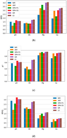 Comparison of single-sensor partial least squares (PLS) modeling of visible-near-infrared (NIR) and X-ray fluorescent (XRF) with different data fusion schemes including outer product analysis (OPA), Granger–Ramanathan (GR), and least squares (LS) in terms of (a) root mean square error (RMSE), (b) ratio of performance to inter-quartile (PRIQ), (c) coefficient of determination (R2), and (d) ratio of performance to deviation (RPD). The soil attributes are: pH, organic carbon (OC), magnesium (Mg), and calcium (Ca).