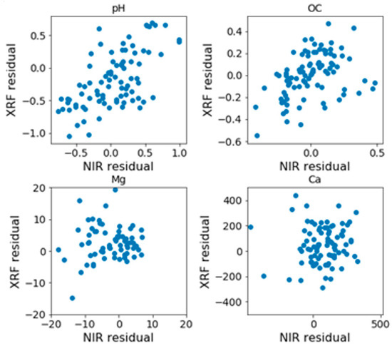 The correlation between the residuals of the predictions given by visible-near-infrared (vis-NIR) and X-ray fluorescence (XRF) models.