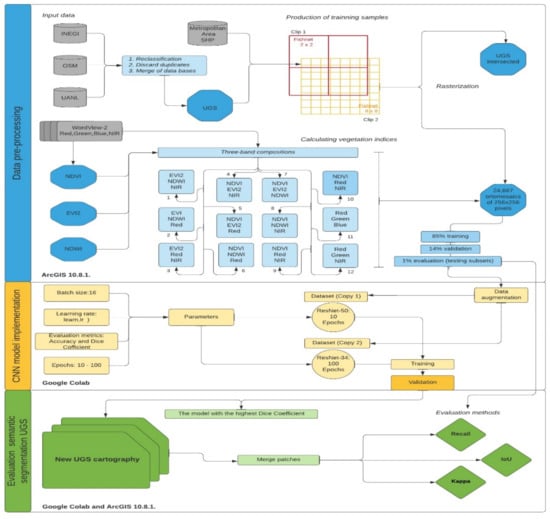 The methodological workflow is shown in Figure 2, where the methodology is divided into three sections: data preprocessing, CNN model implementation, and evaluation of semantic segmentation of UGSs. For this study, we used a UGS definition based on the “Regulation of Environmental Protection and Urban Aesthetics of Monterrey” [56]. This document describes UGSs as land surfaces containing vegetation, gardens, groves, and complementary minor buildings for public use within the urban area or its periphery. Input label polygons for the CNN models were obtained from three sources, the UGS database of the National Geostatistical Framework (2010) of the National Institute of Statistics and Geography (INEGI), the collaborative Open Street Maps (OSM) project [57], and the database of median strips of the MMA arranged by the Department of Geomatics of the Institute of Civil Engineering of the UANL [58].