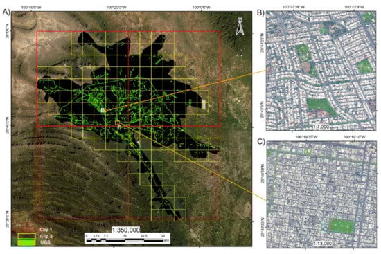 Production of training samples. (A) A 1:350,000 scale map with the result of data homogenization and rasterization of UGSs (light green polygons) with two raster extraction processes shown in red mosaics fishnet (Clip 1) and yellow fishnet (Clip 2). (B) Irregular geometry 1:7000 scale map of UGSs (light green polygons) extracted from Clip 2 and (C) Irregular geometry 1:13,000 scale map of UGSs (light green polygons) extracted from Clip 2.