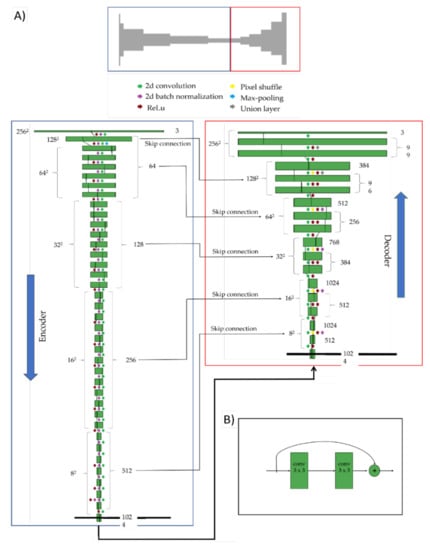 Twenty-four semantic segmentation models were implemented via CNN, two for each band composition generated. ResNet-34 and ResNet50 encoders pre-trained by the ImageNet dataset [65] were used in a dynamic U-Net architecture implemented in the fastai deep learning library [66]. This library works with the Python language and the PyTorch library [67] as a backend. Figure 4A shows the architecture for the model based on the pre-trained ResNet-34 encoder. Each model received 256 × 256 pixel images as input. ResNet network architectures integrate connection jumps (Figure 4B) that avoid the leak gradient problem present in other types of networks [68]. This helps to maintain performance and precision despite increases in the number of training layers [69]. At the point of the greatest compression in the FCN, a decoder was attached that follows the principle of the U-Net architecture to finally obtain an output equal in size to the input images.