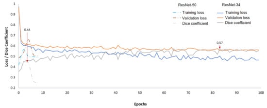 Figure 7 illustrates the behavior of the training and validation process for the highest Dice coefficient for both encoders. As observed, the ResNet34 learning process extended to the 100 epochs (fluctuating between 0.45 and 0.63) and presented its peak at the 83rd epoch, reaching a Dice coefficient of 0.5748. In contrast, the ResNet50 learning process activity occurred during the first 10 epochs, reaching the best Dice coefficient of 0.4378 on the 4th epoch.