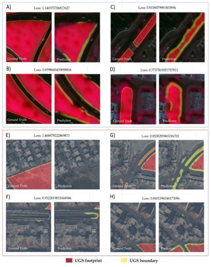 Semantic segmentation studies using similar approaches to map urban tree coverage, buildings, and roads [85,86,87] reported dice coefficients of 0.94, 0.84, and 0.87, respectively. The result in this study is lower (0.57), which may be related to the complexity of mapping UGS polygons. The referenced studies focus on the segmentation of classes that represent the city coverage; however, this research seeks to segment the pixel class and also several types of geometry. Additionally, UGS polygons are composed of a mix of pixels representing not only vegetation but also other kinds of infrastructure, such as sidewalks and playgrounds, which decrease the certainty for the segmentation process.
