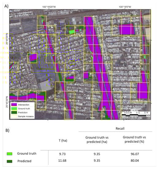 IoU metric was 0.75 for the evaluation of the NDVI–red–NIR composition. This was calculated using the polygons presented in Figure 9A. The recall analysis revealed that the ground truth data had an overlap of 96.07% with the predicted data and the proportion of the overlapping polygons corresponding to the predicted data was 80.04% (Figure 9B).