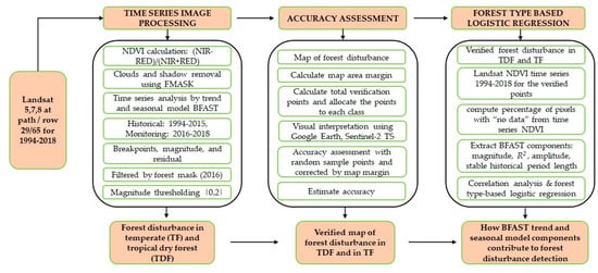 This study evaluated the contribution of the components of BFAST model and the percentage of NAs in a time series to forest disturbance detection. Time series NDVI from Landsat spanning 1994–2018 was applied, employing BFAST model in both temperate forest and tropical dry forest and its accuracy was evaluated by 624 random sample points. Afterwards, BFAST model components, including goodness-of-fit (R2), magnitude, amplitude, length of the stable historical period, and the percentage of NA, were extracted from the time series data of the verified disturbances. The main findings are the following: