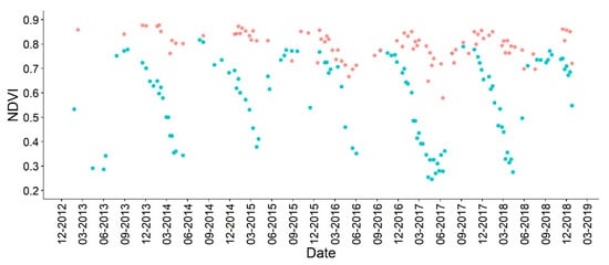 We employed Landsat-5 TM, Landsat-7 ETM+, and Landsat-8 OLI level-1 terrain-corrected (L1T) surface reflectance scenes at path/row (29/65) from 1994 to 2018 available from Google Earth Engine (GEE, []). We applied cloud-and-shadow masks, with the FMASK algorithm [] built into the GEE to mask out clouds and cloud shadows. Intercalibration of the different Landsat sensors has been recommended to reduce the sensor effects on the radiometry of the scenes []. In our case, we considered using uncalibrated scenes that would have minor effects on the change detection, since the selected historical period (1994–2015) includes at least two complete years where Landsat-7 ETM and Landsat-8 OLI were operational. Therefore, we assume that the BFAST algorithm can fit a stable model, considering the NDVI variations between the two different sensors.
