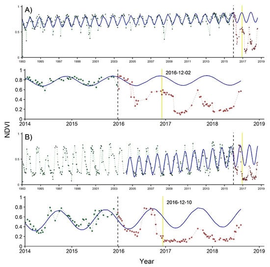 NDVI time series from 1993 to 2018 with detected disturbances in two types of forest. (A) The first row shows the complete profile of a pixel in temperate forest, while the second row shows the same time series, but amplified to the 2014–2019 interval. (B) The same as (A) but for a pixel in tropical dry forest. The dashed vertical black line separates the observations of the historical period, represented by green points, from the ones of the monitoring period, represented by red points. The blue solid line indicates the modeled trend that is fitted in the historical period and projected into the monitoring period. Note that the start of the blue line also indicates the beginning of the stable historical period. The yellow vertical line indicates the date when a breakpoint was registered.