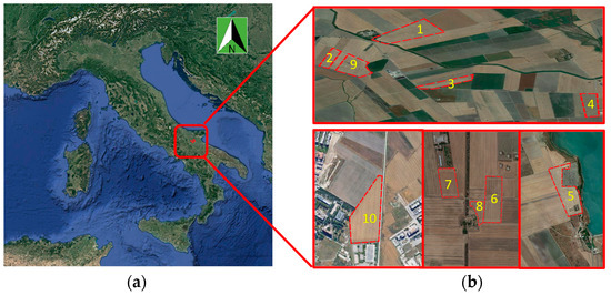 Italy (a) and in the red box Foggia province and (b) the ten fields studied (1–10).