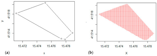 For each field, a regular grid of points identified by their geographical coordinates was prepared, with a layout of 3 × 3 m (Figure 2). The map projection was converted from WGS84 to the UTM projection system to express the distances in physical units (meters). Therefore, the distances between the sites within the field can be expressed as absolute distances (meters) instead of relative distances (degrees), facilitating interpretation. For this operation, we used the spTransform function of the “rgdal” package [50] which converts the geographic coordinates to UTM Cartesian coordinates.