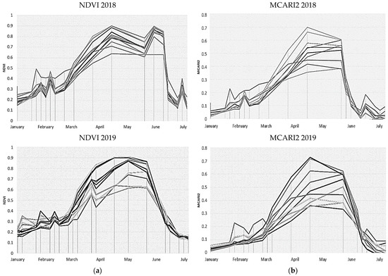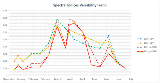 The results of spectral indices NDVI and MCARI2 were placed in chronological order, covering the entire time span of cultivation curve of durum wheat (Figure 3). The two indices showed the same trend reflecting the crop phenology with an accurate synchronization with the durum wheat growth. In the past, several studies have reported to use of remote sensing for estimating biomass accumulation and predicting crop phenology by analyzing VI time-series data [60]. Currently, interest has shifted to the use accumulated NDVI throughout the wheat growing season with the measurements taken at GS30, GS32, GS37, and GS65 growth stages, which are considered more informative [61]. Zheng et al. [62] selected three key periods (mid-March, mid-April, and mid-May), corresponding to the early, middle, and late wheat growing stages, respectively, to validate the relationship between the satellite imagery and estimated biomass. In our study, the trend of the two vegetation indices showed a high variability during the entire growth cycle of durum wheat in the 10 fields. The variability of the values of the two spectral indices was observed by analyzing the variation of the standard deviation between the values measured on each coordinate, for each observation date over the two years (Figure 4).