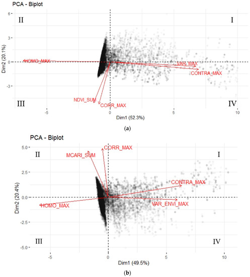 Regarding the NDVI, homogeneity (−0.57) and contrast (0.57) showed greater influence on the first component (Table 6), while correlation (0.66) and NDVI_sum (0.64) showed the greatest influence on the second component. In the case of MCARI2, variance (0.55), homogeneity (−0.55), and contrast (0.59) showed the greatest influence on the first component (Table 6), while the correlation (0.71) and the MCARI2_sum (−0.67) showed the greatest influence on the second component.