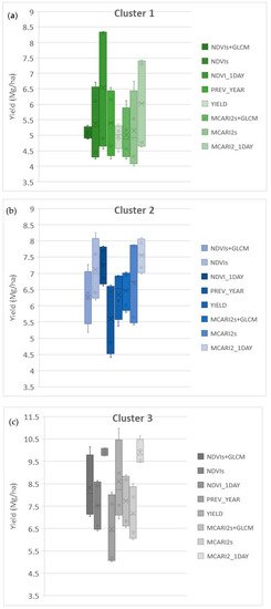 Boxplot of the ranges of yield values intercepted in the three clusters (a–c) by the methods studied.