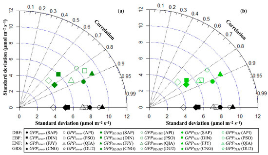(a) Taylor diagram of hourly modeled GPPBEAMS and hourly GPP estimates based on flux tower monitoring (μmol m−2 s−1) at selected FFNet DB/FLUXNET2015 sites. (b) Taylor diagram of hourly modeled GPPTLM and hourly GPP estimates based on flux tower monitoring (μmol m−2 s−1) at selected FFNet DB/FLUXNET2015 sites.