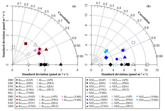 (a) Taylor diagram of hourly modeled Re and hourly Re estimates based on flux tower monitoring (μmol m−2 s−1) at selected FFNet DB/FLUXNET2015 sites. (b) Taylor diagram of hourly modeled NEE (the difference of hourly modeled Re and GPPtower) and hourly NEE estimates based on flux tower monitoring (μmol m−2 s−1) at selected FFNet DB/FLUXNET2015 sites.