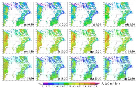 Diurnal variation of (a–l) hourly modeled Re (gC m−2 h−1) in the study area on 3 July 2018.
