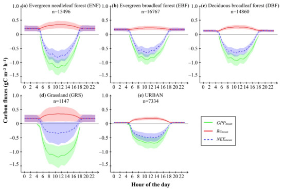 Hourly NEE (the difference of Re and GPP) in different types of ecosystem was also presented by the mean and standard deviation among all grid cells in Figure 6. At night, Re was the sole contributor of hourly NEE, and therefore the latter shared the same range of values described in the paragraph above. In the daytime, the strongest net carbon uptake occurred in ENF, up to –0.82 ± 0.22 gC m−2 h−1, followed by DBF, EBF, urban land with partial vegetated cover, and GRS, up to −0.66 ± 0.13, −0.65 ± 0.16, −0.49 ± 0.15, and −0.35 ± 0.41 gC m−2 h−1, respectively.