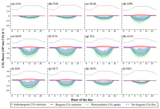 (a–l) Hourly integrated anthropogenic CO2 emissions (104 ton CO2 h−1) in 2018, compared to hourly integrated biogenic CO2 emissions, photosynthetic CO2 uptake, and net biogenic CO2 flux of the Greater Tokyo Area (104 ton CO2 h−1) during the period 2010–2018. Shadows represent the variation (the minimum to the maximum) of hourly integrated biogenic CO2 emission (red), photosynthetic CO2 uptake (green), and net biogenic CO2 flux (blue).