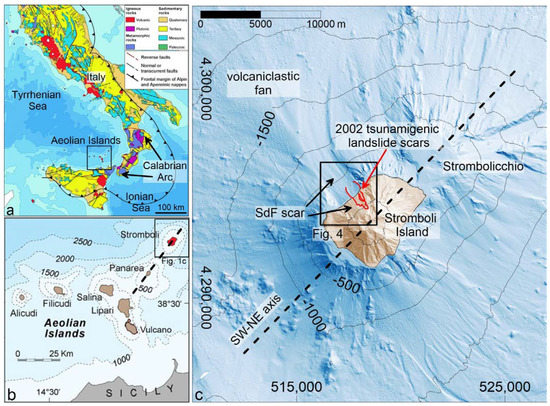 Figure 1. (a) Simplified geological map of Italy (modified from [6]), with the location of the Aeolian Islands (black box); (b) zoom of the Aeolian archipelago in the Southern Tyrrhenian Sea, with the geographical location of Stromboli Island (in red) and the main SW–NE regional system (black dashed lines) controlling the Stromboli–Panarea alignment; (c) shaded relief map and contour lines (equidistance 500 m) of the Stromboli edifice (location in Figure 1b), with the indication of the 2002 tsunamigenic landslide scars (see also Figure 4a) and the main rift axis oriented along the SW–NE direction.