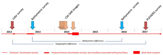 Data used for this research mainly rely on the analysis of morphological changes detected by using high-resolution topo-bathymetric surveys collected before and after the 2014 eruption along the SdF collapse scar and time-lapse SAR (synthetic aperture radar) amplitude images collected between May and August 2014 (Figure 3 and Table 1).
