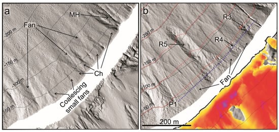 The E1 channelized area (Figure 5 and Ch in Figure 6b) roughly matches the location of a large morphological high (MH in Figure 6a) on the 2013 DEM; the smaller E2 erosive area corresponds, instead, to an area previously characterized by small-scale coalescing fan-shaped features (Figure 6a).