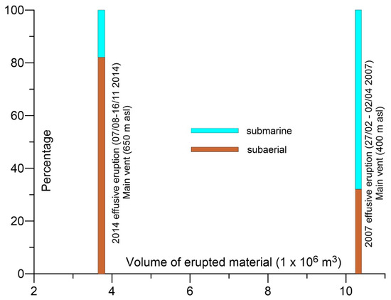 More generally, the results of this study are important to better understand the behavior and morphological evolution of lava flows penetrating into the sea, mainly in relation to the paucity of bathymetric monitoring of coastal areas during eruptive crisis [25,38], with observations mainly limited to the subaerial part of lava deltas [27,39,40] or scuba dives at water depth less than 50 m [41,42]. This is a very important issue considering the possible hazard associated with these events in active insular and coastal volcanoes.
