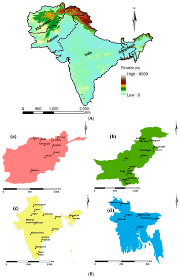 (A) Elevation map of the study area. (B) Locations of drought affected regions during the drought year 2002 in Afghanistan (a), Pakistan (b), India (c) and Bangladesh (d).