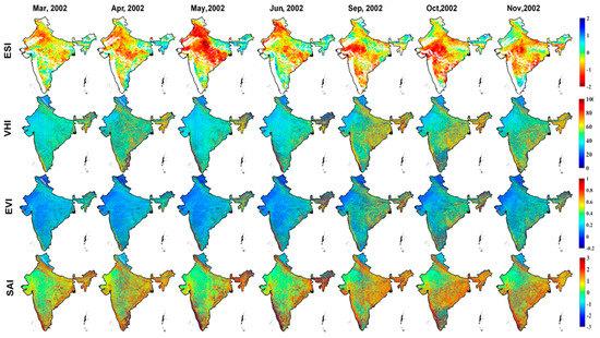 Based on the first episode, the northwestern and eastern regions of the country remained under the stress of drought. These regions include Delhi, Lucknow, Jaipur, Bhopal, and Chandigarh (Figure 1B). It can be seen that drought has a deep influence over Orissa, South Bihar, and Madhya Pradesh along with the earlier-mentioned regions, except for the southern parts of India during May. Drought tended to ease in most of the parts at the beginning of June, due to the excessive monsoon rainfall, when there was no water deficiency found except in the northwestern areas, Orissa, and eastern parts of Madhya Pradesh. India receives southwest monsoon as a primary source of water for agriculture with intermediate dry spells, which is highly variable in space and time [55]. However, during the late summer season or at the beginning of the autumn, a second episode appeared, covering mostly the southern and southeastern parts. These regions include Tamil Nado eastern Bangalore, western Andhra Pradesh, and Maharashtra (Figure 1B and Figure 6). The northeast region Guwahati and Assam also continued under drought stress during November. In the case of VHI and SAI, drought has been seen in May and June while in the case of EVI from March to June. The EVI recognized the same regions as ESI in the first episode but during the second episode, it sustained less sensitivity as compared to the ESI. It is interesting that from March to June mostly the northeastern and western saw drought conditions, while from September to November, the southeastern and western regions of India were under dry conditions. As a whole, severe agricultural drought appeared from March to June and September to November (7 months) during the drought year (2002) and the ESI identified it better and was found to be more sensitive in terms of a drought-detection tool. Our findings are well connected with the investigations carried out by Chandrashekhar et al. [56], expressing that rainfall had remained below average during the year 2002, causing the first severe drought in India since 1987; indeed, the monsoon season of India was exceptional, being 19% drier as compared to average monsoon season. Drought during the monsoon season decreases soil moisture contents sharply and can have implications for agriculture and water management [29].