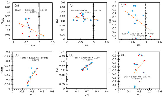 (a–f) Scatter plots showing the correlations between the drought indices (ESI, VHI) and climate variables (TRMM, SM, LST) during the drought year (2002).