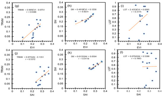 (g–l) Scatter plots showing the correlations between the drought indices (EVI, SAI) and climate variables (TRMM, SM, LST) during the drought year (2002).